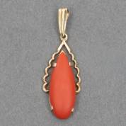 14kt gouden hanger gezet met een druppelvormige cabochongeslepen bloedkoraal, brutogewicht 2,8 gram, 4 × 1,2 cm