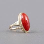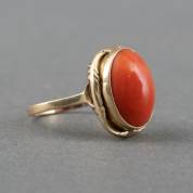 14kt gouden ring gezet met ovaal cabochongeslepen rode bloedkoraal, mt. 17,25, brutogewicht 4,4 gram