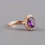 18kt roségouden entouragering, centraal gezet met ovaal gefacetteerde amethist, omgeven door briljantgeslepen diamanten, totaal circa 0.32ct, mt. 17,5, brutogewicht 4,0 gram
