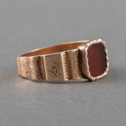 14kt gouden herenring met fijne gravering en gezet met plat geslepen carneool, 19e eeuw, mt. 21, brutogewicht 6,0 gram