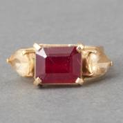 14kt gouden ring gezet met tafelgeslepen robijn geflankeerd door twee peergeslepen citrienen, mt. 17,5, brutogewicht 6,2 gram