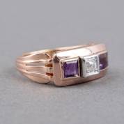 14kt bicolor gouden ring gezet met twee prinsesgeslepen amethisten en een bolsjewiekgeslepen diamant, circa 0.20ct, mt. 18, brutogewicht 6,6 gram