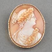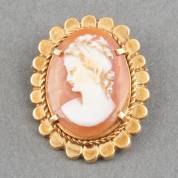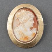 14kt gouden cameebroche van dame en profil met gesatineerd gouden montuur, brutogewicht 12,0 gram, 4,5 × 3,5 cm