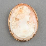 Ovale 14kt gouden cameebroche gezet met schelpcamee met beeltenis van dame en profil, tevens te gebruiken als hanger, brutogewicht 16,2 gram, 4,5 × 3,5 cm