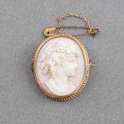 14kt gouden cameebroche met schelpcamee van damesportret, pin en veiligheidsketting onedel, brutogewicht 7,2 gram, 3 cm