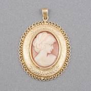 14kt gouden hanger gezet met schelpcamee van dame en profil, brutogewicht 5,4 gram, 5 × 3 cm