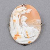 Schelpcamee-broche gehouden in zilveren brochemontuur, 19e eeuw, 4,5 × 3,5 cm