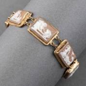 3e gehalte verguld zilveren armband gezet met zeven rechthoekige schelpcameeën met veiligheidskettinkje, brutogewicht 20,6 gram, lengte circa 18 cm