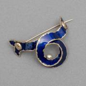 Blauw-geëmailleerde 18kt gouden lintbroche, 14kt roségouden speld, bevestigd met tinsoldeer, brutogewicht 23,4 gram, 6,3 × 4,6 cm -sluiting vermaakt, defect in email, ongekeurd-