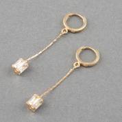 Paar 14kt gouden oorhangers met aan kettinkje een tonvormige hanger, elk gezet met vijf baguettegeslepen bergkristallen, brutogewicht 3,0 gram, circa 4,5 cm
