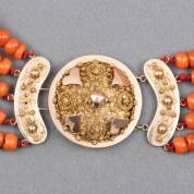 Vijfstrengs bloedkoralen kralencollier van kaaskralen aan 14kt gouden filigrain streekdrachtslot, 37 cm