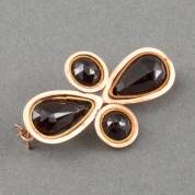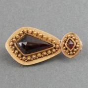14kt roségouden broche gezet met twee ronde en twee druppelvormige facetgeslepen granaten, brutogewicht 5,8 gram, 4 × 2,5 cm -kleine chips en deukjes aan achterzijde-