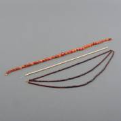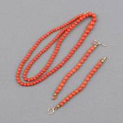 En chûte geregen bloedkoralen kralencollier aan 14kt gouden veerring, daarbij: twee losse korte strengen aan 14kt gouden kapittelslot,