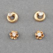 Twee paar 14kt gouden oorstekers; één paar solitairstekers gezet met diamantje, het andere paar cirkelvormig gezet met diamantje, brutogewicht 2,8 gram, Ø 6 mm en 3,5 mm