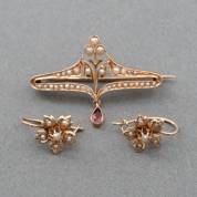 14kt gouden broche gezet met zaadpareltjes en pampel met toermalijn, daarbij: paar BWGG bloemvormige oorhangers gezet met zaadpareltjes, brutogewicht 4,8 gram, broche 4 cm, oorhangers 2 cm