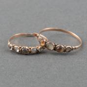 Twee 14kt gouden rijringen met parelmoerkleurig kristal, mt. 20,5 en 18, brutogewicht 2,2 gram -kleinste ring gebroken, grootste ring één steen missend-