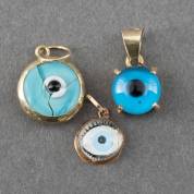 Drie boze oog-hangers in gouden montuur, brutogewicht 1,8 gram, grootste circa Ø 11 mm -grootste oog gebarsten-