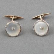 Paar 14kt wit- en geelgouden manchetknopen gezet met parelmoer en diamantje in oudslijpsel, brutogewicht 5,6 gram, Ø 14 mm