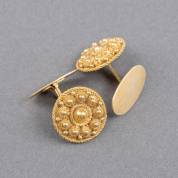 Paar 14kt gouden filigrain manchetknopen gevormd als Zeeuwse knopen, gewicht 7,2 gram, Ø 1,6 cm
