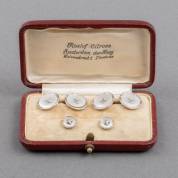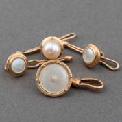 Paar 14kt gouden boordknoopjes met parelmoer, enkel 14kt gouden boordknoopje met parelmoer en pareltje, en 14kt gouden boordknoopje gezet met parel, brutogewicht 6,4 gram, grootste knoop Ø 13,3 mm