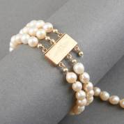 Drie strengs parelarmband van gecultiveerde parels aan 14kt gouden bakslot met bloemgravering, 18 cm -één streng gebroken, goudkeur gesleten-