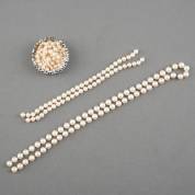 Losse streng van geknoopte gecultiveerde parels, 57 cm, dubbele streng parels van armband met twee witgouden verdelers, 19 cm, en doosje losse parels van en-chûte parelcollier van gecultiveerde parels met gouden draadhangertje met parel