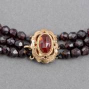 Driestrengs granatencollier met 14kt gouden bakslot gezet met gefacetteerde granaat, brutogewicht 75 gram, lengte circa 45 cm