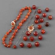 Carneoolkralen, hoedenpin met carneool en twee 14kt gouden baksloten gezet met carneool