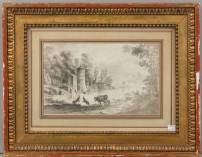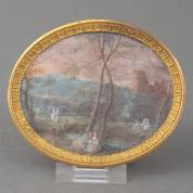 Miniatuurschilderij: veduta van figuren in een landschap, op de voorgrond een liefdespaar en in het verschiet ruïnes, gouache, 18e/19e eeuw -enkele minieme beschadigingen-, 7 × 9 cm