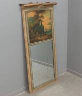 Schouwspiegel met parelrand en bovenin een schildering: vrouwen en hond in landschap, 19e eeuw -schildering vergeeld, gebruikssporen-, 142 × 61 cm