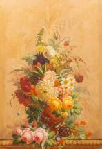 Schilderij: bloemstilleven op plint, olieverf op doek, niet gesigneerd, eind 19e eeuw, 102 × 71 cm