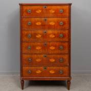 Mahonie chiffonnière met zes lades en ingelegde biezen, de lades met ingelegde schelpvormen, de zijkanten met strikken en bloemen, Louis Seize -enkele defecten aan fineer, krimpscheuren in de zijkant, stukje profiel is los-, 148,5 × 88,5 × 50 cm
