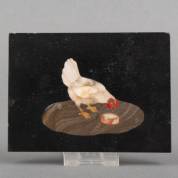 Klein natuurstenen mozaïek: kip bij voederbak -kleine randchipjes-, 12 × 9 cm