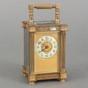 Messing reiswekker met opstaand hengsel en ruitjes rondom, Frankrijk, circa 1900, winkeliersadres op wijzerplaat: Veerhof & Co, Kalverstraat Amsterdam -zonder sleutel-, 15 × 8 × 7 cm