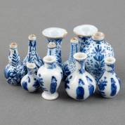 Diverse blauw-witte Makkumer aardewerk miniatuurvaasjes, en enkele Chinees porseleinen miniatuurvaasjes, grootste 6 cm