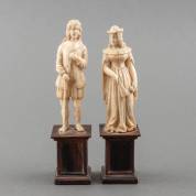 Paar maritiem ivoren beeldjes: man en vrouw in laat 16e-eeuwse kledij, vermoedelijk Frankrijk, 18e eeuw, hoogte 10 cm, op houten basementjes van later datum