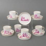 Zes Loosdrechts porseleinen kop-en-schotels met bietenrood decor van landschappen met burchten, de schotels met opstaande randen, de kopjes gemerkt in onderglazuur blauw M:O.L., de schotels op het biscuit gemerkt in bietenrood M:O.L. -meerdere kopjes met chips in standring, waarvan één grotere-, Ø schotels 12,5 cm