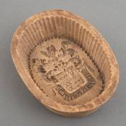 Houten botervorm met wapen van de familie Clifford Cocq van Breugel en motto 'In trinitate fortitudo', 4 × 14 × 11 cm