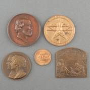Vijf diverse legpenningen, waaronder: bronzen huwelijkspenning Juliana en Bernhard 7 januari 1937, in foedraal Koninklijke Begeer, legpenning ter gelegenheid van de onthulling van het Monument op de Dam te Amsterdam, 1856, en legpenning 'Enduring Friendship Netherlands America 1782-1982', Ø penning monument op de Dam 7,5 cm