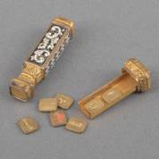 Verguld koperen cachet / signet met email decor in wit en zwart, hol handvat waarin zeven verwisselbare plaatjes met afbeelding en een spreuk/motto, 19e eeuw, lengte 6 cm