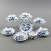 Zeven porseleinen 'Fels und Vogel' kommetjes en schoteltjes met blauw-wit decor, uitvoering Meissen, Duitsland -een kommetje met chip-, schoteltjes Ø 12 cm