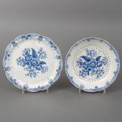 Porseleinen natfruitschaal op onderbord, met blauw-wit floraal transferdecor, gemerkt, uitvoering Worcester, Engeland, 18e eeuw, Ø onderbord 24,5 cm