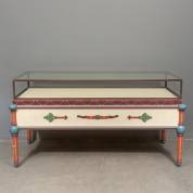 Rechthoekige polychroom beschilderde toonbank met gesneden ornamenten en beglaasde bovenzijde, 20e eeuw -zijruiten ontbreken, een poot iets korter-, 100 × 189 × 73 cm, herkomst volgens inzender: Bijenkorf Eindhoven