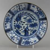 Japans porseleinen schotel met blauw-wit bloem- en vogeldecor in Wanli-stijl, Arita, circa 1700 -glazuurcraquelé-, Ø 27,5 cm