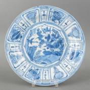 Kapitale Chinees kraakporseleinen schotel met blauw-wit decor: centraal een visser met bootje in rivierlandschap, de rand met figuren en schepen in vakverdeling, Chongzhen -grote randchip, enkele kleine randchipjes en wat glazuurverlies langs rand-, 10 × 48 cm