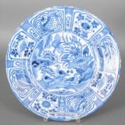 Chinees kraakporseleinen schotel met blauw-wit decor: ganzen in landschap, Wanli, Ø 32 cm