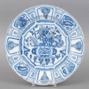 Delfts aardewerk schotel met blauw-wit decor in Wanli-stijl: bloemenvaas met kostbaarheden, de rand met bloemen en kostbaarheden in vlakverdeling, 17e eeuw -randdefecten-, Ø 34 cm