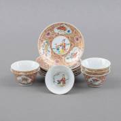Zes Chinees porseleinen kommetjes en schoteltjes met famille rose decor: centraal een figuur met bloemenmand, daaromheen bloemen in cartouches, Yongzheng -alle met randschilfers, één kommetje en één schoteltje met haarlijn-, afmetingen schoteltjes Ø 10 cm