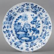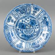 Chinees kraakporseleinen schotel met blauw-wit decor van bloemenvaas, de rand met bloemen en kostbaarheden in vlakverdeling, Wanli -chip en randschilfers-, Ø 31,5