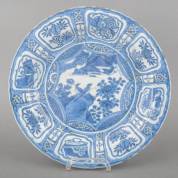 Chinees kraakporseleinen schotel met blauw-wit decor van twee vogels op rots, de rand met afwisselend kostbaarheden en vruchten, Wanli -twee randchipjes met gerelateerde haarlijnen-, Ø 37 cm